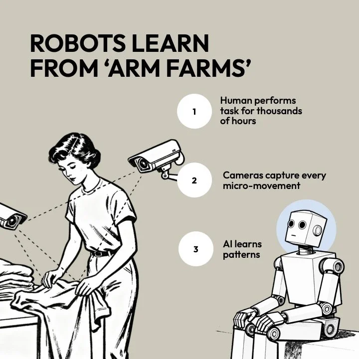 For training robots, they call these "arm farms"—facilities in places like India where workers repeat tasks while cameras capture every movement. Not to build robots. Just to translate human expertise into machine-readable patterns.